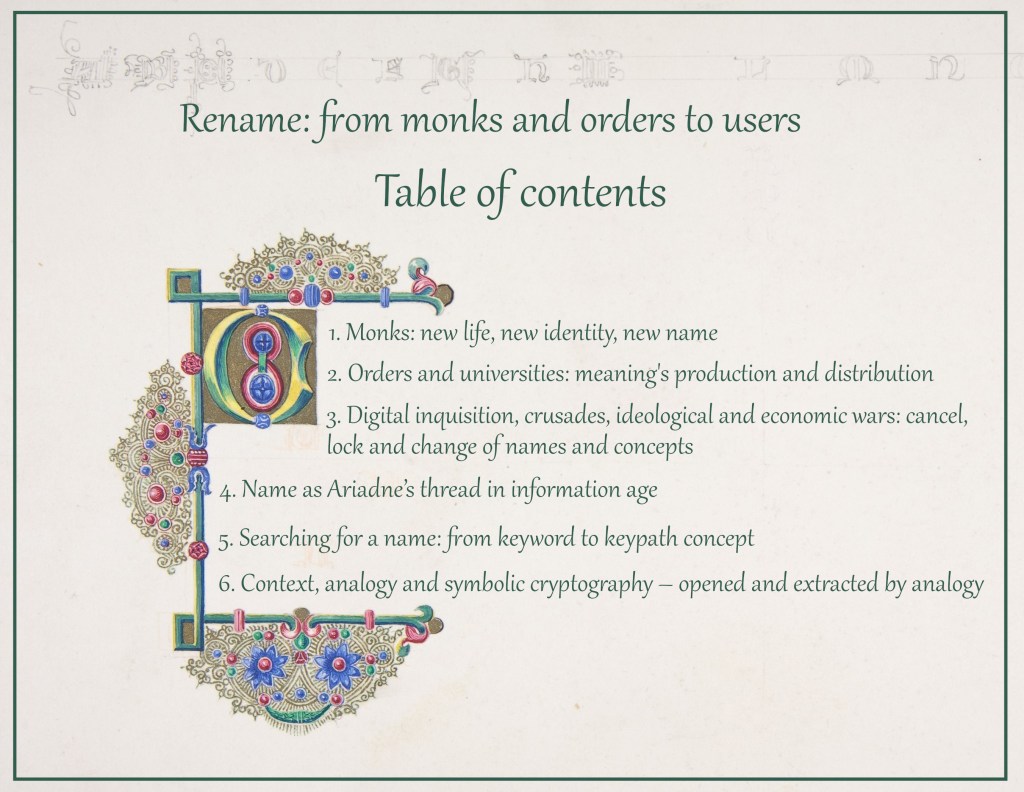 I think that in a digital age, with an extension of actual internet and double physic-digital spaces, names will be infrastructure materials to create a context. I think of analogies as of providers in digital spaces. In this case, names represent materials, which, driven by analogies, allow to organically create and form ideas and communication.