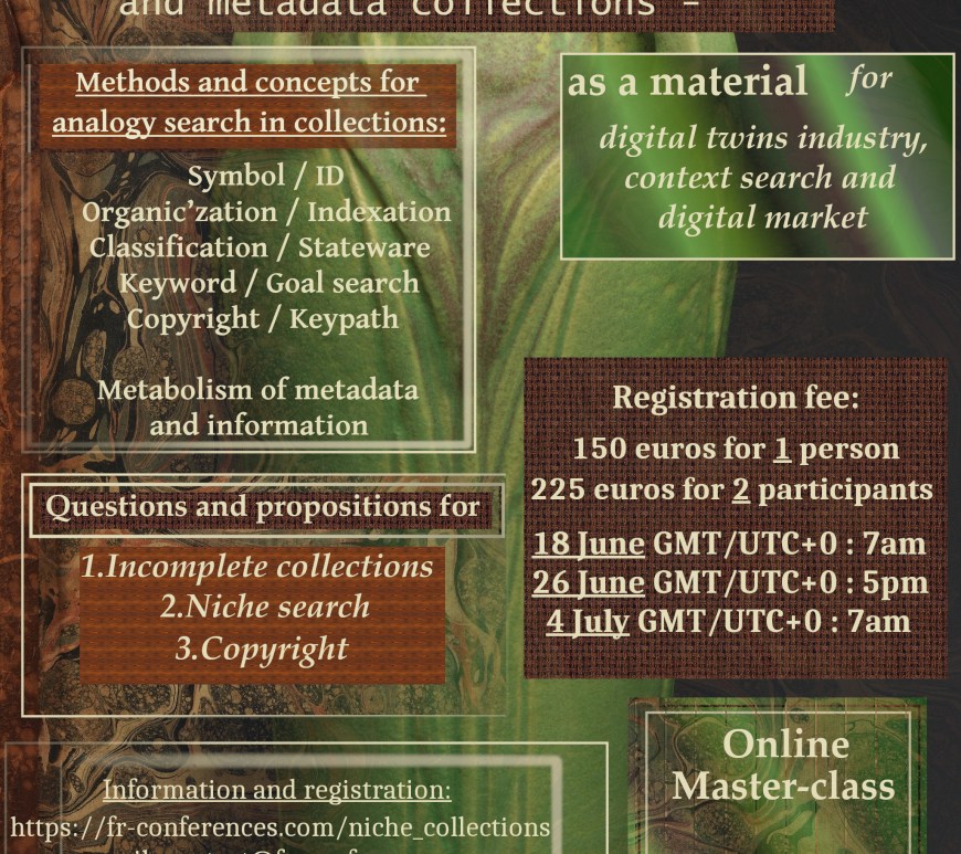 Niche collections of texts, visuals and objects in digital spaces Niche collections Project description _______________________________________________ July 18, 2024 Online, GMT/UTC+0 : 4pm _______________________________________________ Registration fee: 150 euros / 1 person 225 euros / 2 persons _______________________________________________ Niche collections is an online master-class dedicated to the use of niche and local collections of texts, visuals and objects in digital spaces. This master-class focuses on analogies as … Continue reading Master-class Niche collections Summer 2024